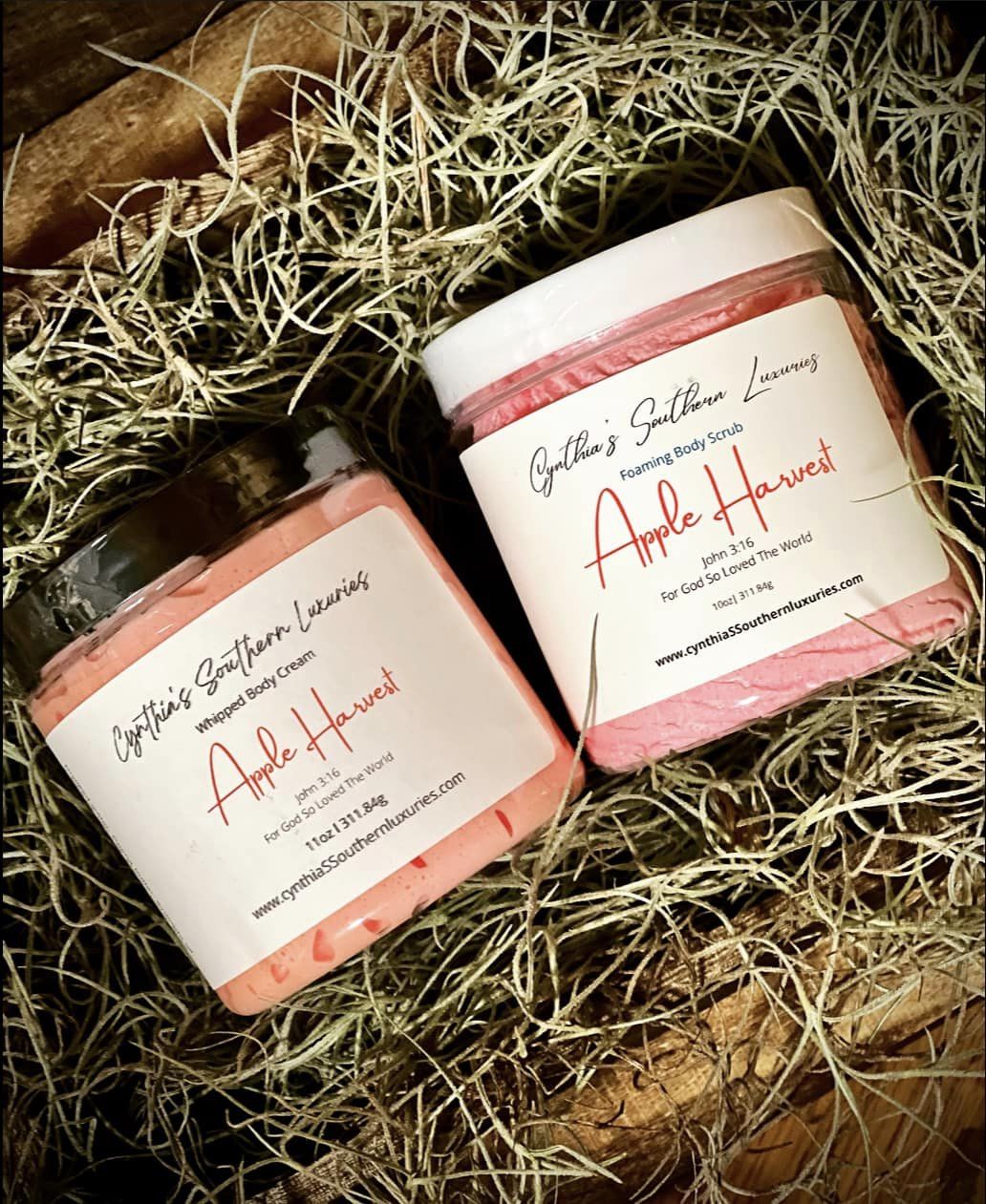 About| After exfoliating with Foaming Butter Scrubs, by Cynthia's Southern Luxuries, show your skin some love by nourishing it with our Whipped Body Cream! Cynthia's Southern Luxuries Just Launched our new line of Body Creams! Our Body creams are a thick creamy moisturizer that leaves your skin silky soft. Our body creams are different from our whipped body butters. Our body creams are water based. They are enriched with jojoba oil, carrot seed oil, sunflower oil, olive oil, avocado oil, and vitamin E known to help regenerate the skin. And yes, they are still enriched with Shea butter, Mango butter, and Cocoa butter. Because these are creams and not body butters, they don't have the greasy feel to them, but do have a sheen.